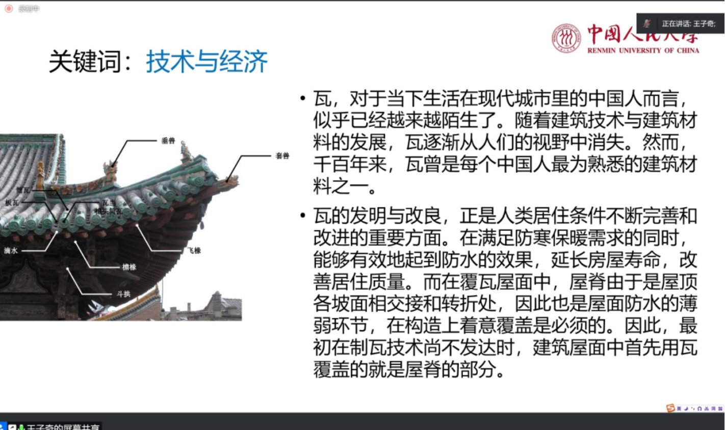 第三组关键词:技术与经济。这里王老师以瓦为例展开,因为瓦在千百年来,曾是每个中国人最为熟悉的建筑材料之一。它的发明和改良,正体现了人类改进居住条件的相关技术的不断进步。老师通过对瓦的发展史的讲述,得出了一个重要结论:瓦的纵向生命史,在《清明上河图》中被横向展开,体现了时间与空间的交织。