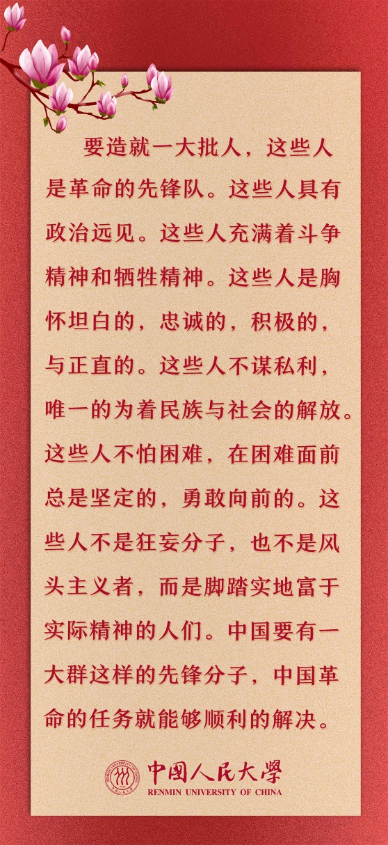 1937年,毛泽东同志为陕北公学成立题词时说:“要造就一大批人,这些人是革命的先锋队。这些人具有政治远见。这些人充满着斗争精神和牺牲精神。这些人是胸怀坦白的,忠诚的,积极的,与正直的。这些人不谋私利,唯一的为着民族与社会的解放。这些人不怕困难,在困难面前总是坚定的,勇敢向前的。这些人不是狂妄分子,也不是风头主义者,而是脚踏实地富于实际精神的人们。中国要有一大群这样的先锋分子,中国革命的任务就能够顺利的解决。”
