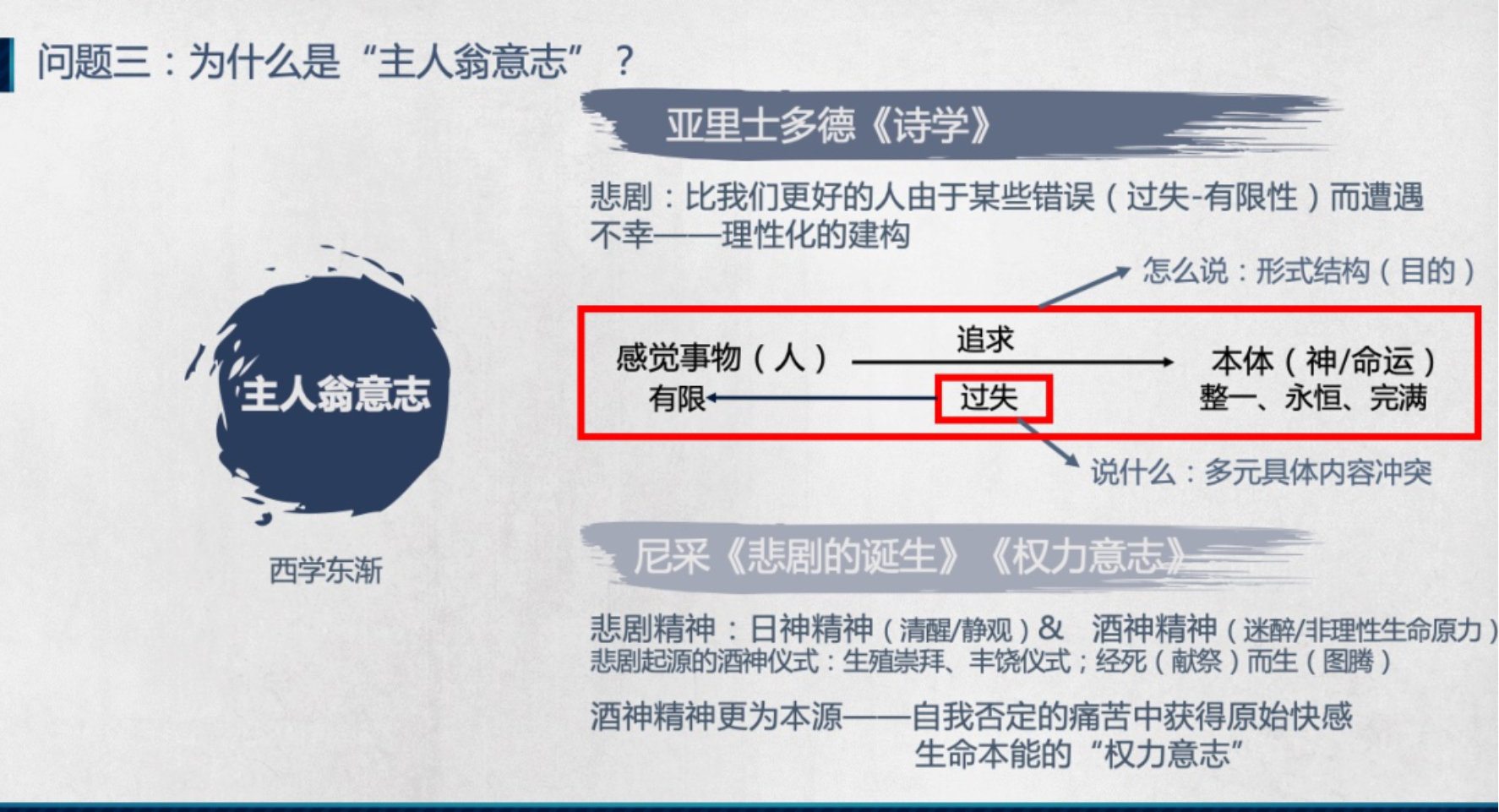 “主人翁意志”概念的产生离不开西学东渐,亚里士多德的《诗学》言及,悲剧是比我们更好的人在以有限追求无限中通过过失发现自己的有限性,认识到整一、永恒、完满的本体;尼采在《悲剧的诞生》《权力意志》中则认为酒神精神是更本源的悲剧精神,在自我否定的痛苦中获得原始快感。
