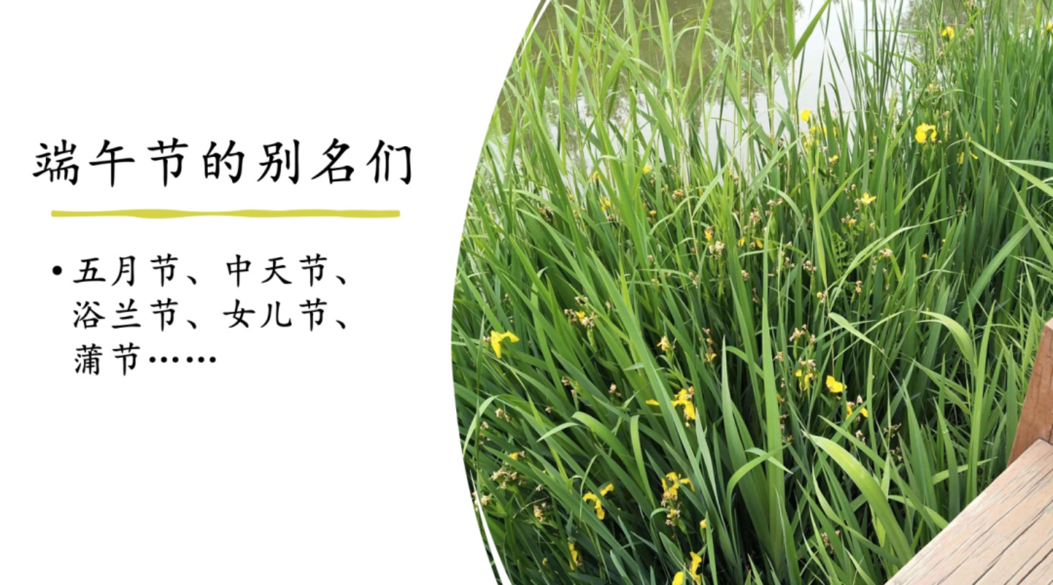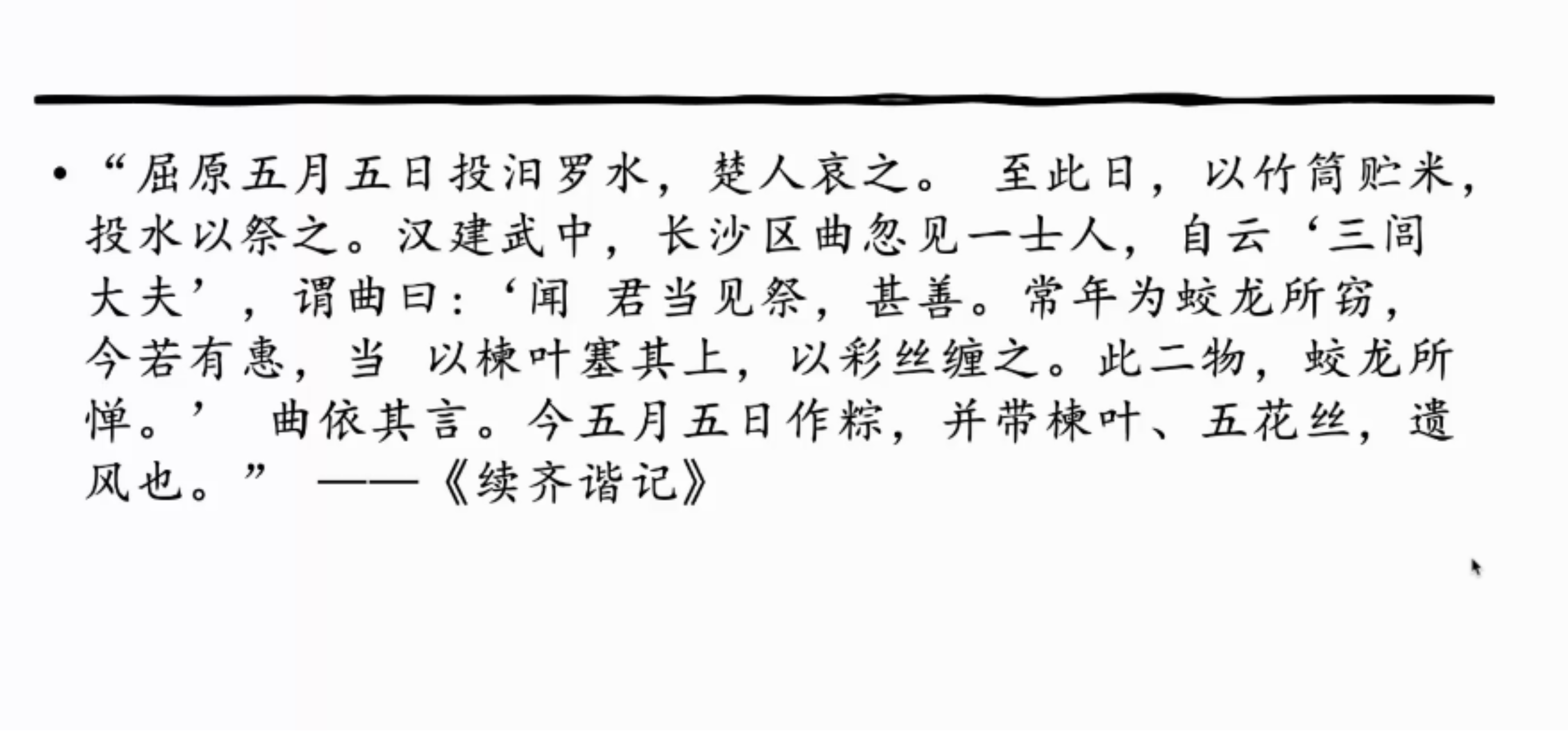 随后,蔡老师提到了端午节的别名和相关的习俗。端午节又称为五月节、中天节、浴兰节、女儿节和蒲节。红楼梦中有诸多关于五月初女性欢乐状态的的细致描写,说明端午对女性生活的意义;陆游《丰岁》诗有“羊腔酒担争迎妇,遣鼓龙船共赛神”,向我们展示了早在宋代已有的躲端午习俗。